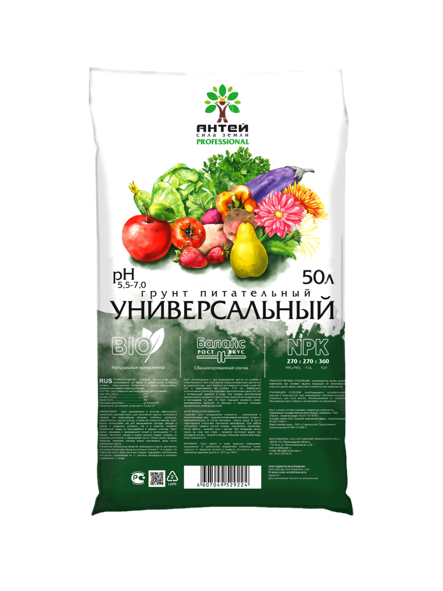 Производится из торфа с добавлением известняковых материалов и микроудобрений. Грунт рекомендуется для выращивания овощных культур, цветочных и плодово-ягодных культур на приусадебных участках, а также для посадки комнатных, балконных цветов и декоративных растений.